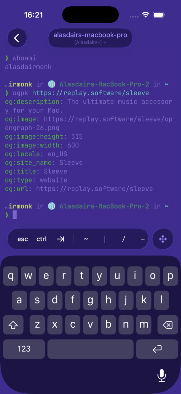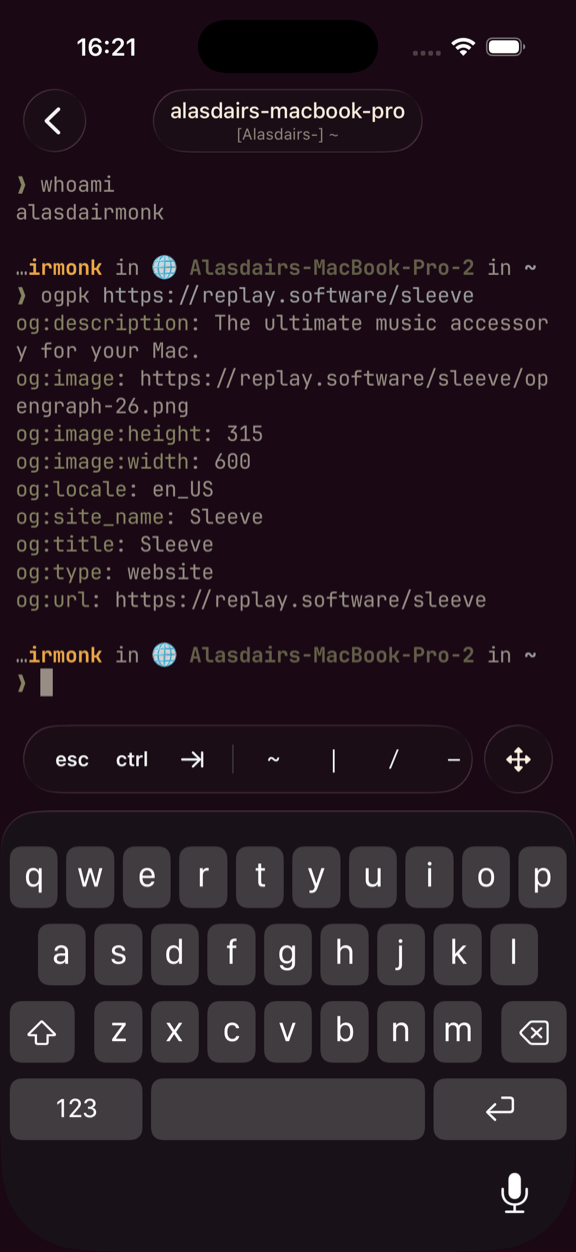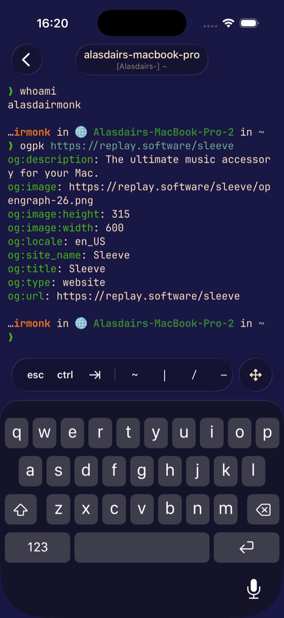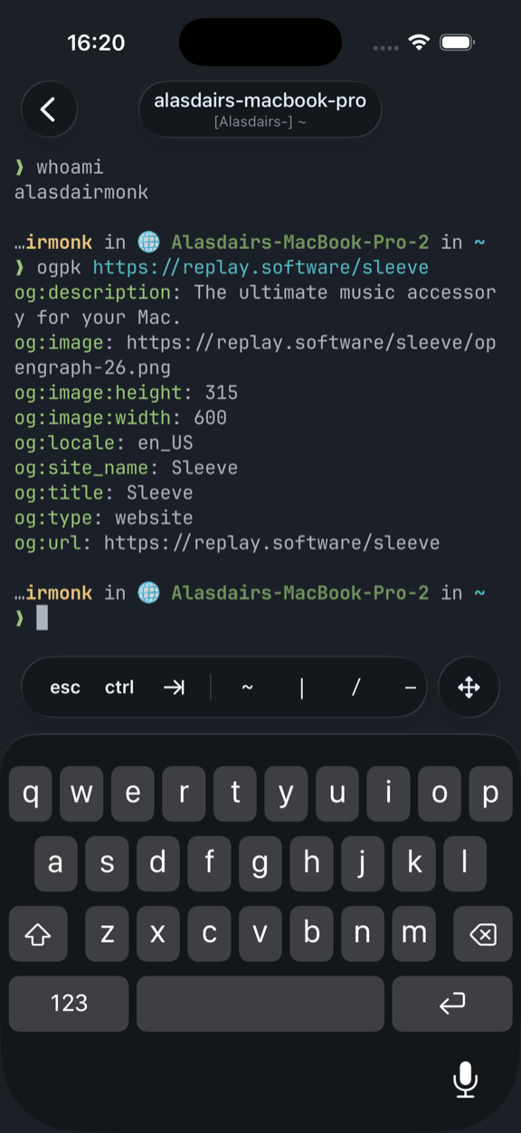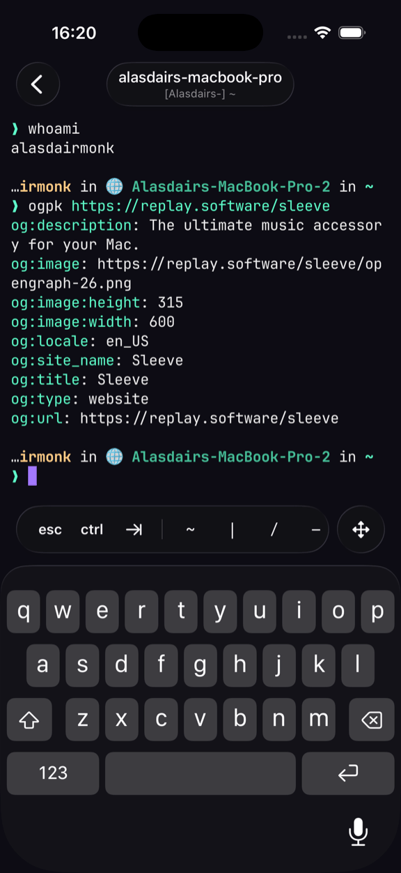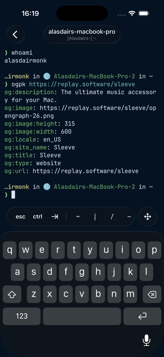 Full hardware keyboard support with standard terminal shortcuts. Ctrl, Meta, arrow keys, and function keys all work exactly as you'd expect.