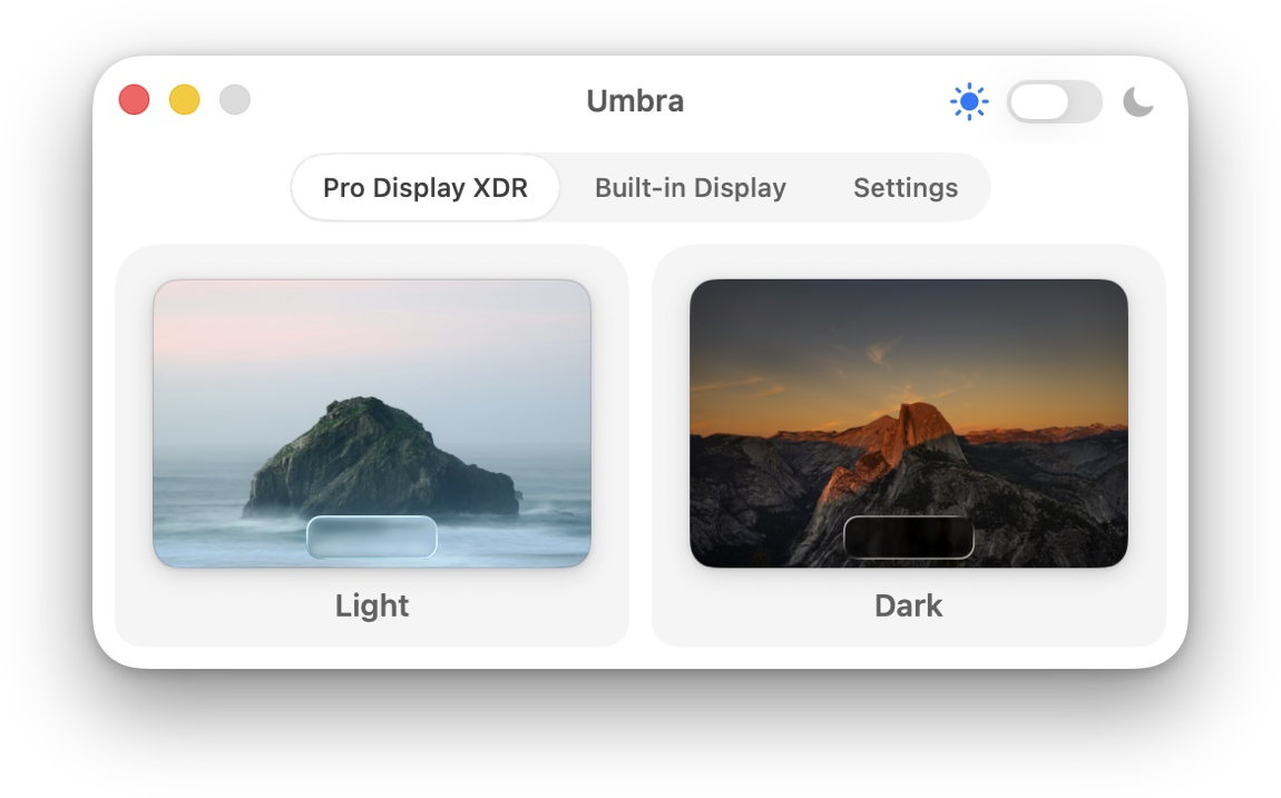 Umbra 1.5 now lets you choose different wallpapers, lightband dark, for each of your connected displays, with Umbra remembering your preferences for each screen. Perfect for multi-monitor setups where you want different wallpapers on each display.
